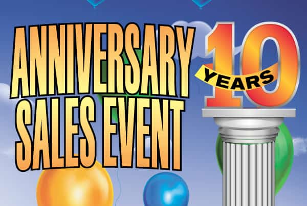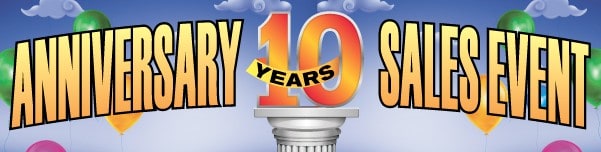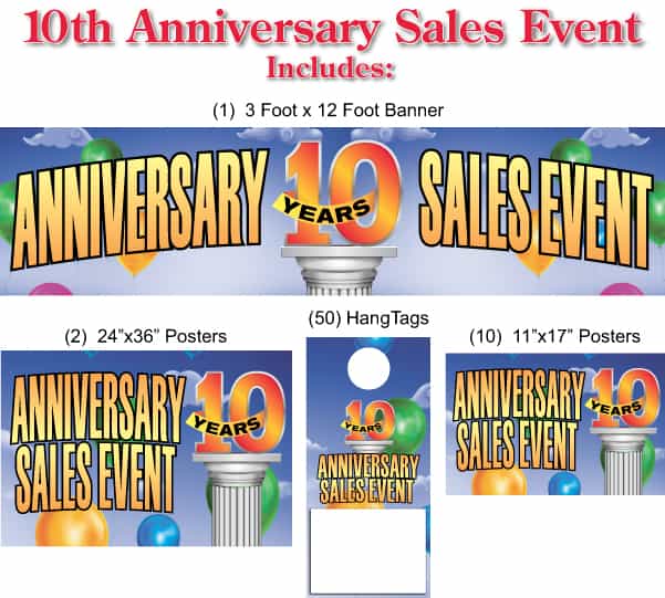 Our High Impact Sales Event Package for your “10th Anniversary Sales Event” will drive your sales forward. Decorate your car dealer showroom or your retail store and order online today.