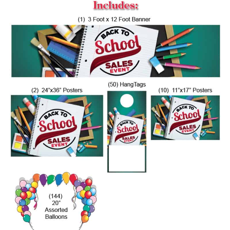 Our High Impact Sales Event Package for your “Back to School Sales Event” will drive your sales forward. Decorate your car dealer showroom or your retail store and order online today.