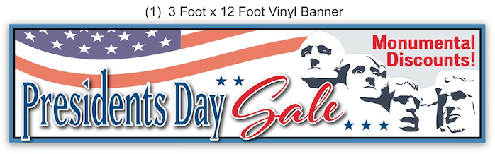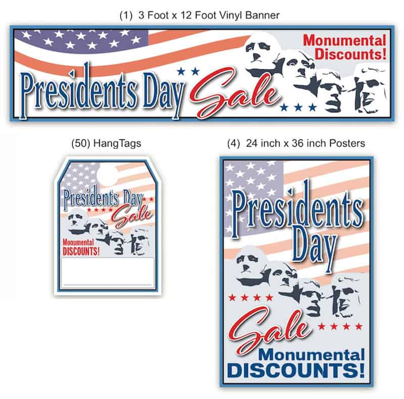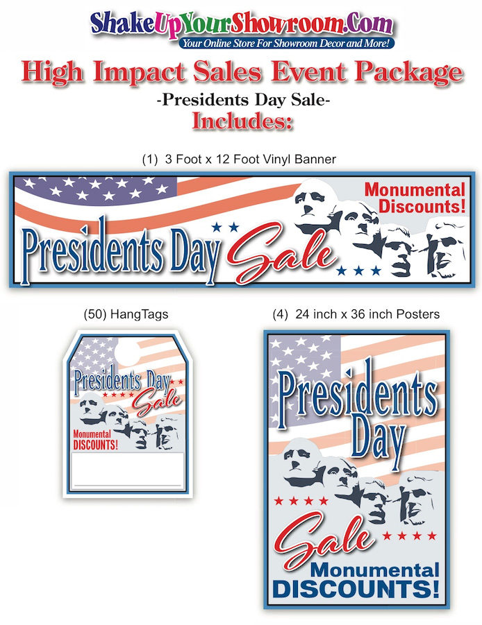 Our High Impact Sales Event Package for your “Presidents Day Monumental Discounts Promotional Package” will drive your sales forward. Decorate your car dealer showroom or your retail store and order online today.