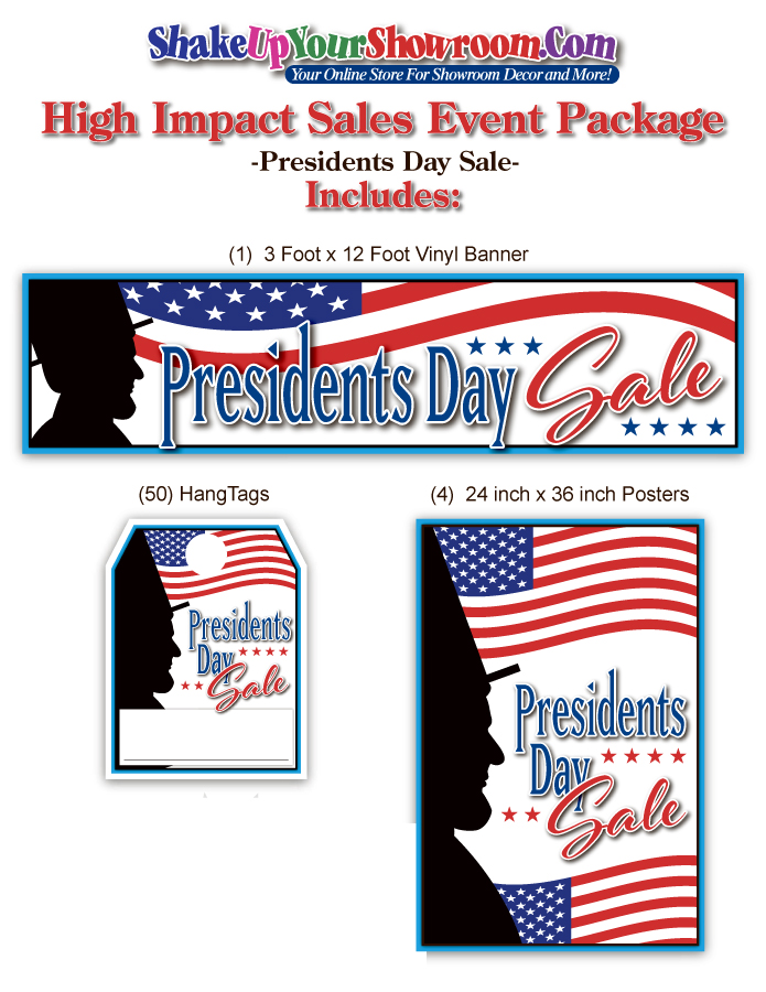 Our High Impact Sales Event Package for your “Presidents Day Sale Promotional Package” will drive your sales forward. Decorate your car dealer showroom or your retail store and order online today.